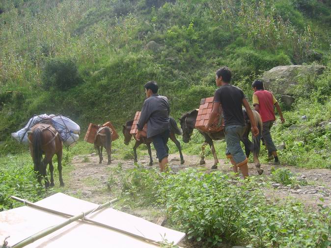 周老师和曹师傅准备先到较远的土坝村校,而马队是往高山上的十二坝村校工地运送物资。可以看见,刚才遇到的马队已经在爬对面的大坡了……