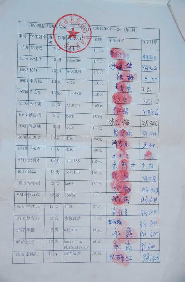 蒗渠中学95批(2010年9月-2011年2月)受助学生签收确认单