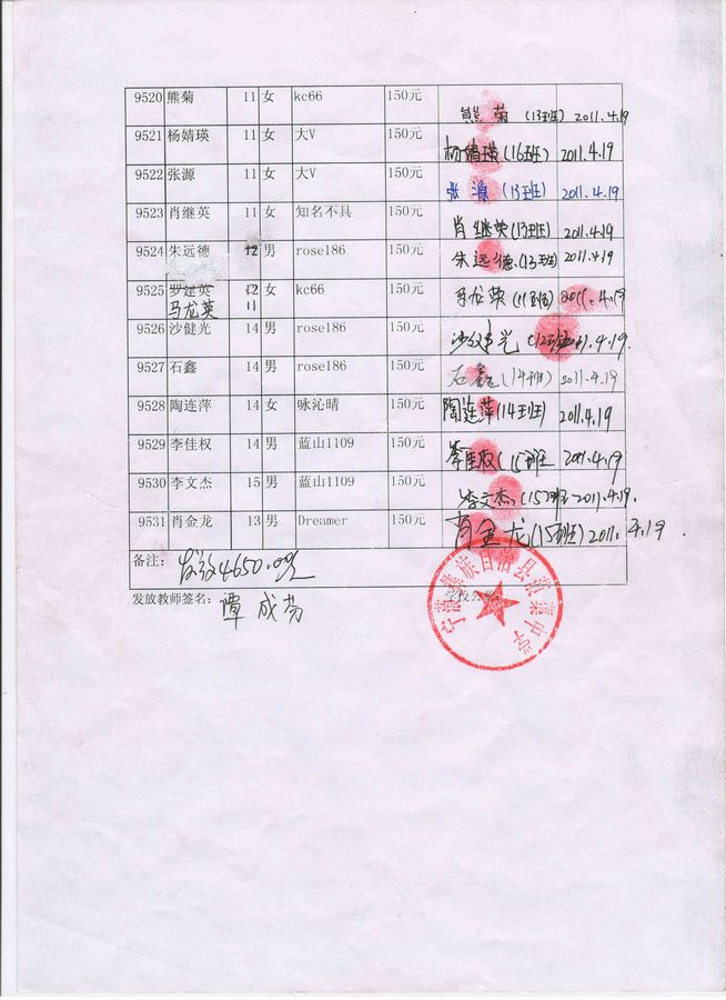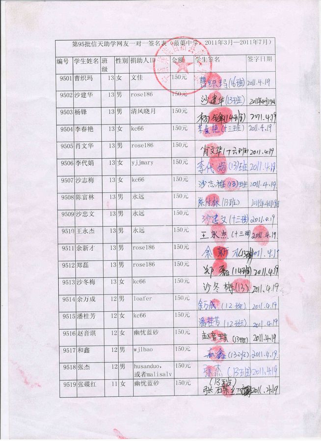 蒗渠中学第95批(2011.3-2011.7)受助学生签字确认单