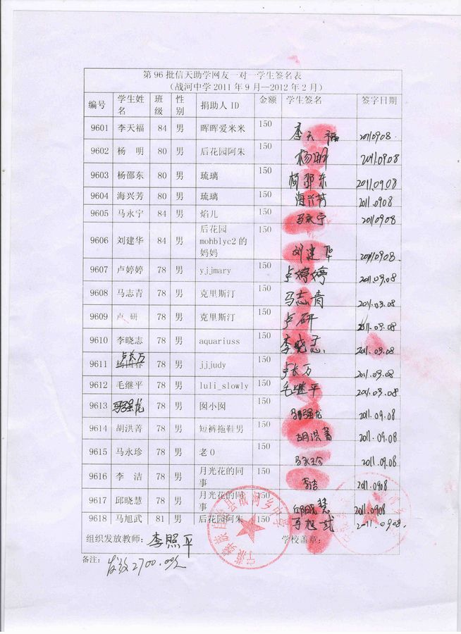 战河中学96批(2011年9月到2012年2月)受助学生签收单