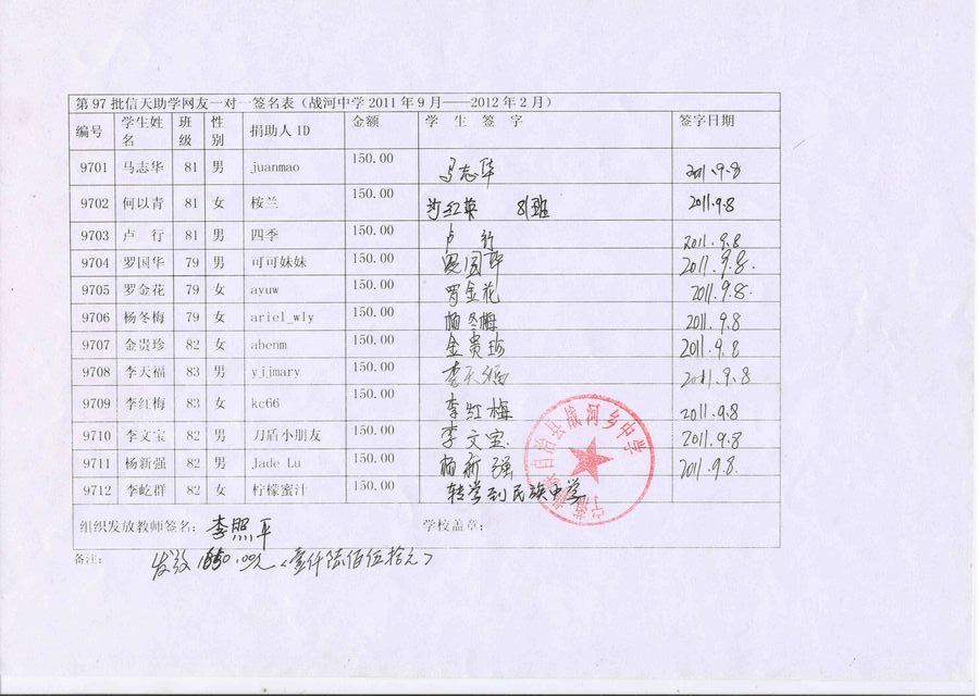 战河中学97批(2011年9月到2012年2月)受助学生签收单