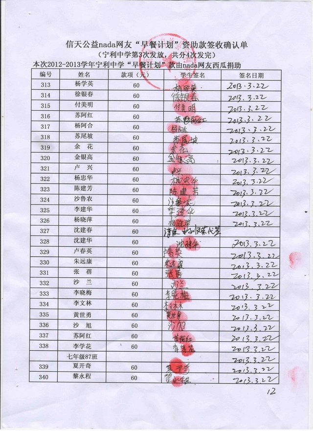 宁利中学2012-2013年早餐计划第三次发款签收单
