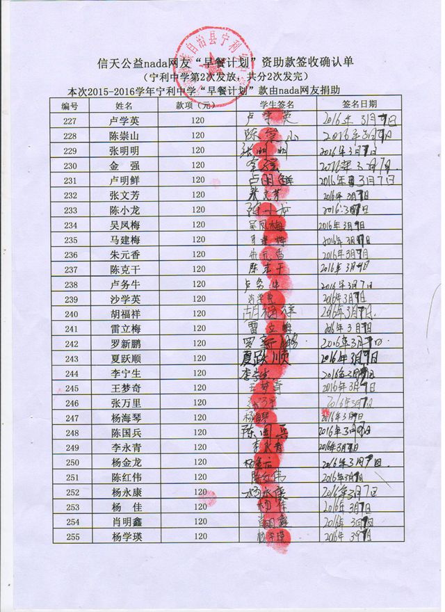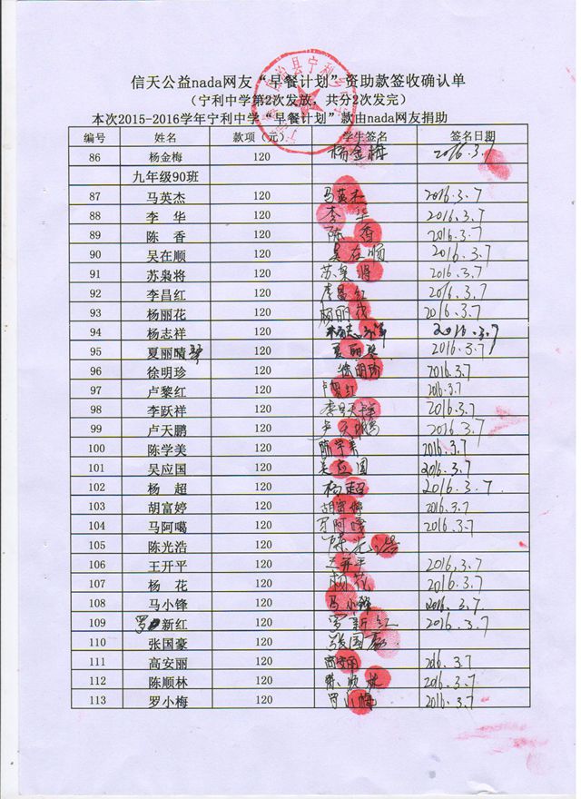 宁利中学,2015-2016年早餐计划第二次发款签收单