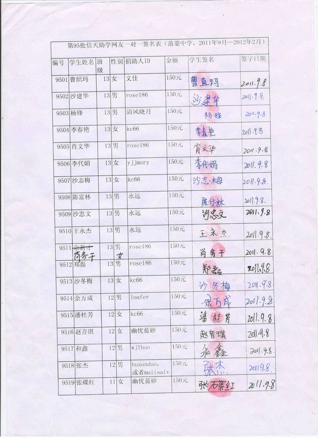 蒗渠中学第95批(2011.9-2012.2)受助学生签字确认单