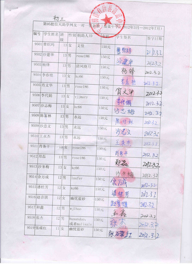 蒗渠中学第95批(2012.3-2012.7)受助学生签字确认单: