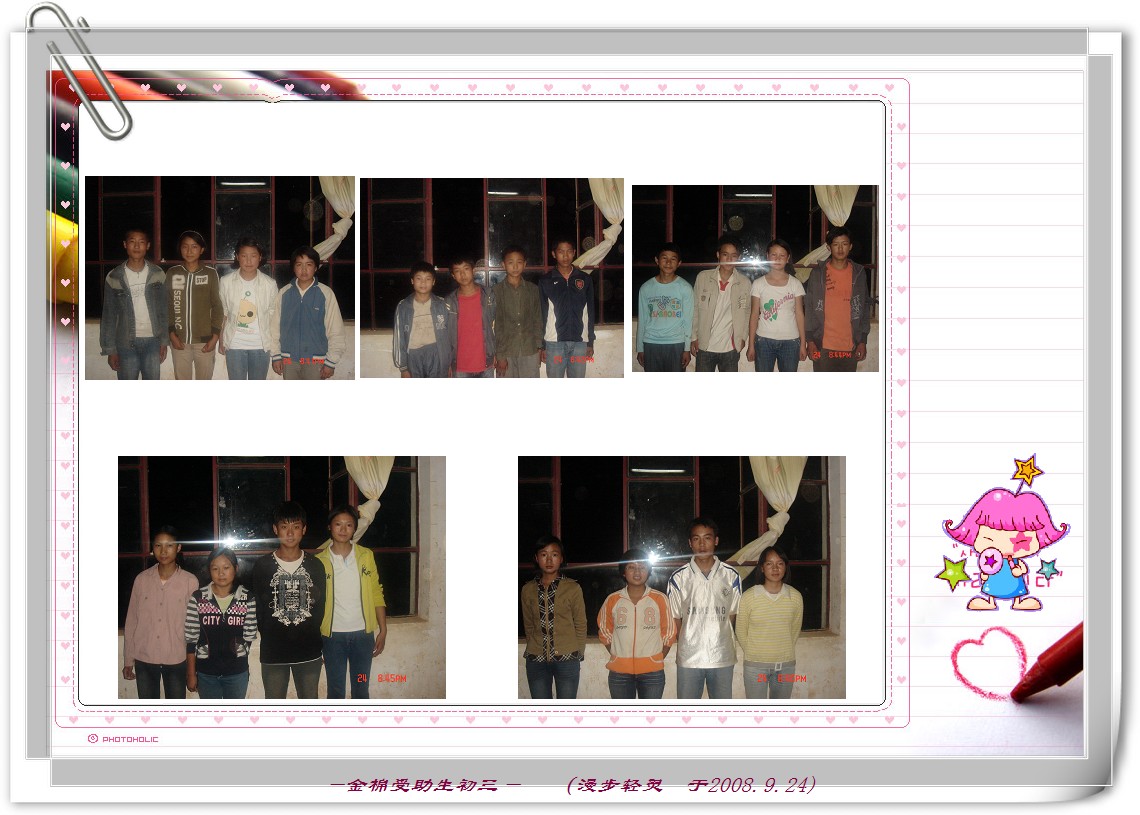 随后浦老师召集了学生,因为学校都在上课,没有空余的教室,我们就在操场里给这些孩子讲了讲,和孩子们一一照相,随后在一间旧的乒乓球教室让孩子们签字告诉他们的本学期资助款项的落实。