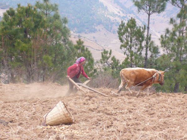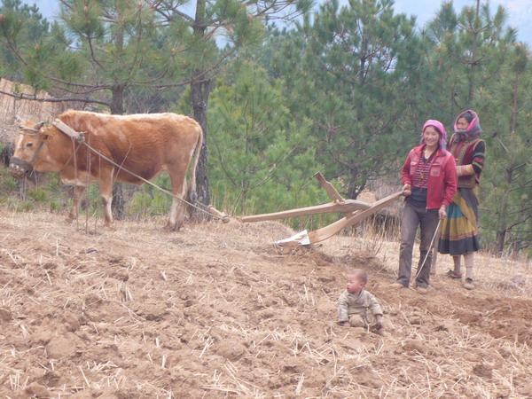 村民在犁地,丈夫外出打工,女人在家种田。