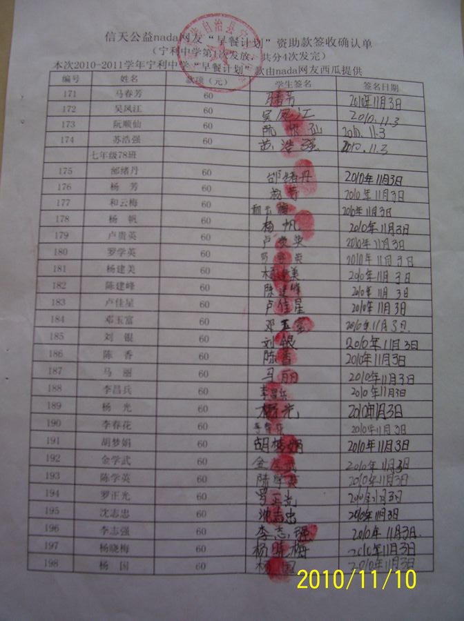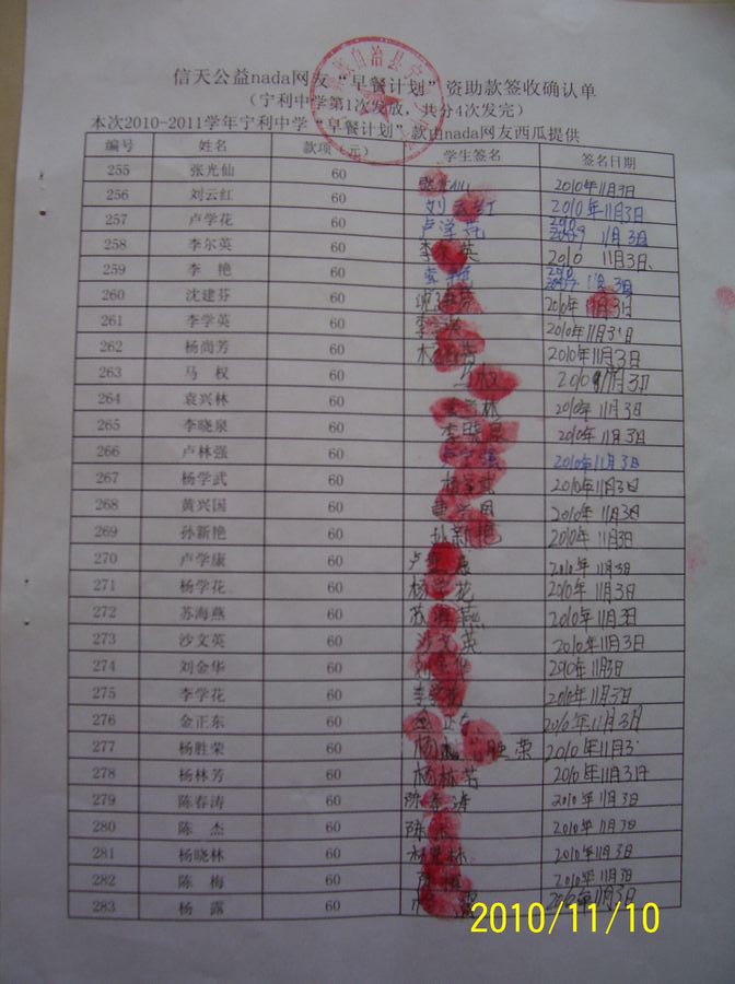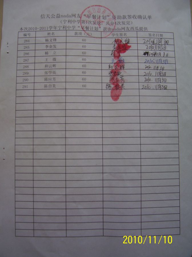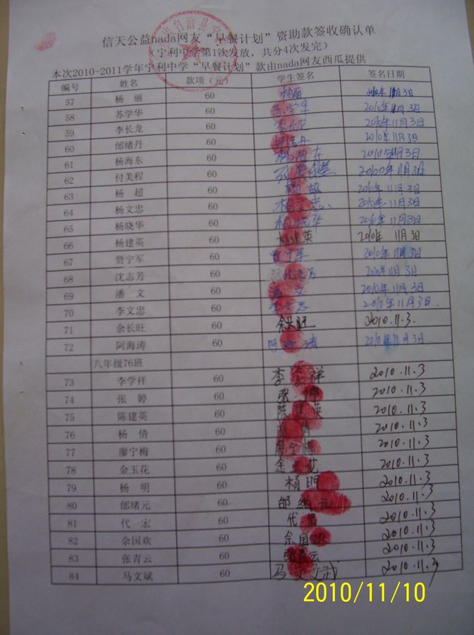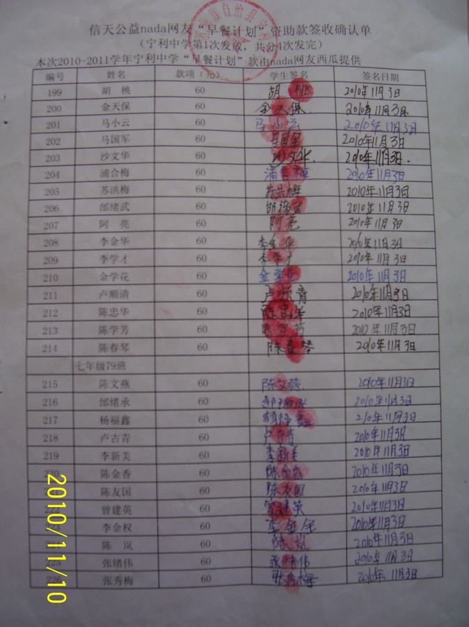 1、nada网友通过OSCCF捐款,USD:$16967.61,折合RMB后汇给信天:¥:112414.30元,捐款起止日期为2010年8月22日--2011年5月5日(2010.12--2011.07年度),收款明细请查看下表“2010年8月22日--2011年5月5日OSCCF早餐收款明细”;