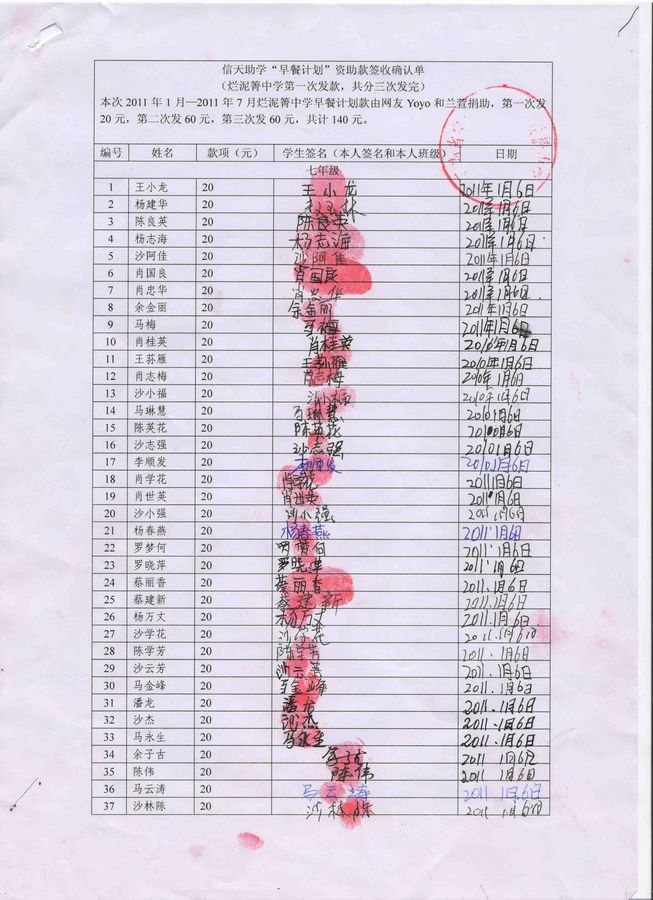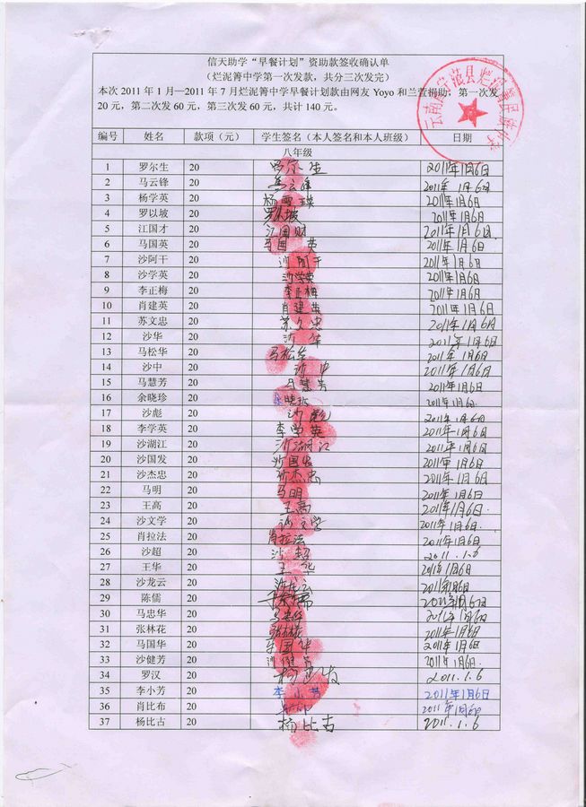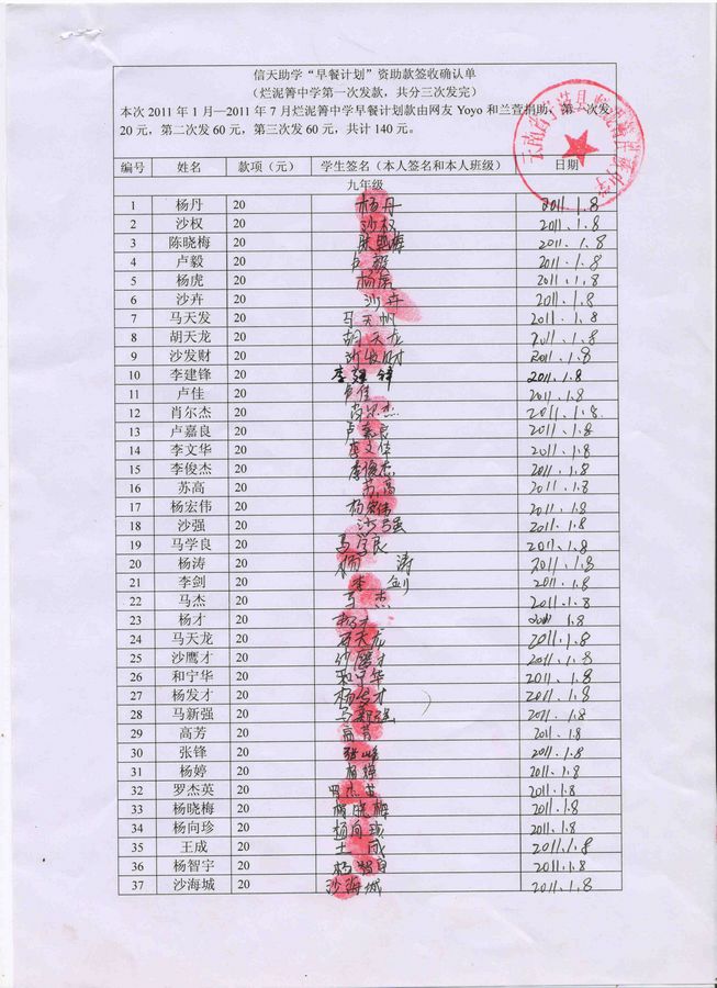 2011年1月(春节前一个月)发给学生每人20元,共计4600元。