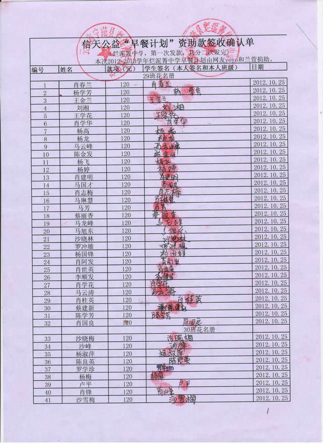烂泥箐中学,2012-2013年早餐计划第二次发款签收单