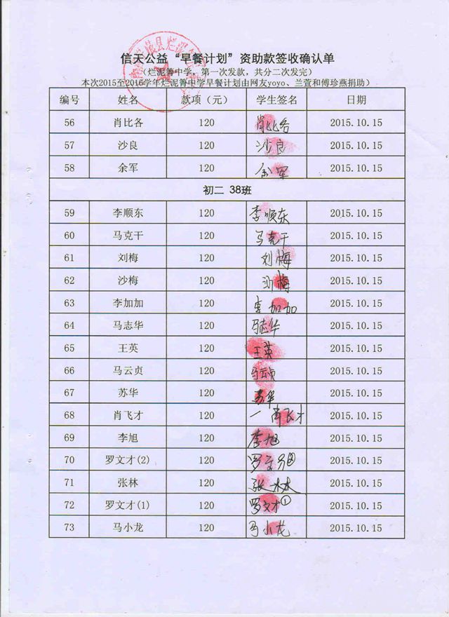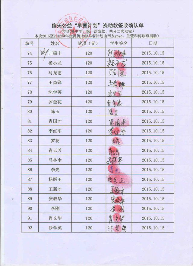 烂泥箐中学,2015-2016年早餐计划第一次发款签收单