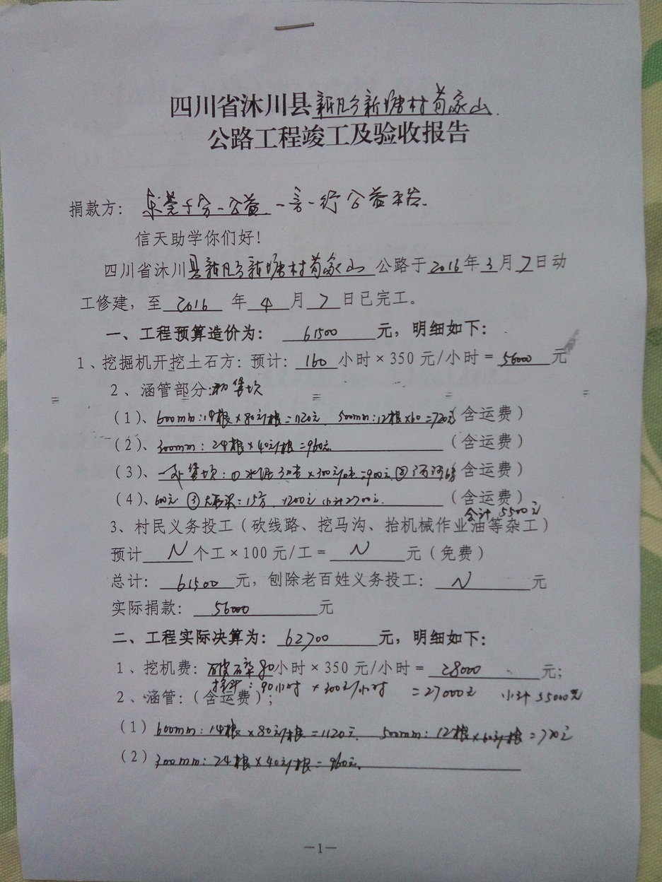 (5)修路预算分好几部分,有挖掘机、涵管、炸药爆破(山崖需要爆破)、堡坎、村民义务工、征地等。修路,我们不全包,我们出一大部分钱:挖掘费用、山崖爆破等。村民出义务工、涵管、征地费、村民小额集资。