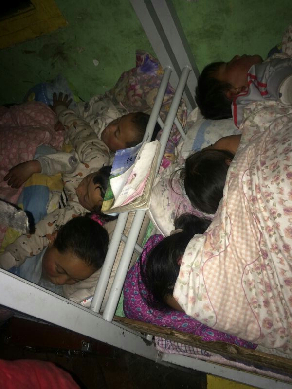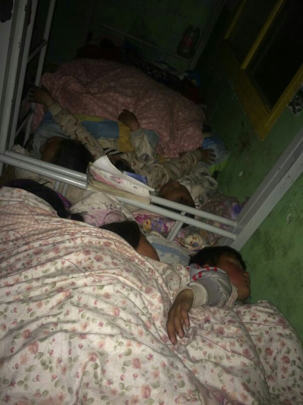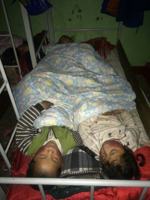 一个床铺上睡3个小学生,每张上下床睡6个小学生,家里的兄弟姐妹挤在一张窄小的床上,急需床和被褥等寝具。