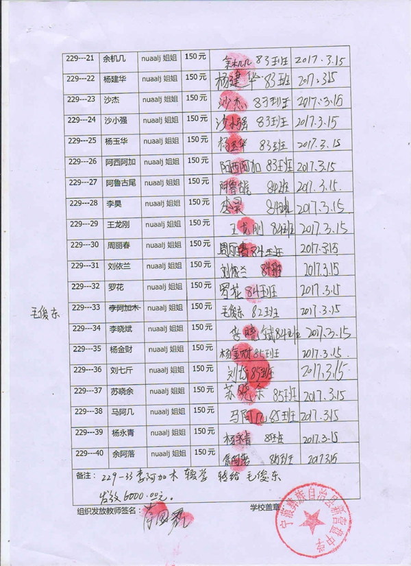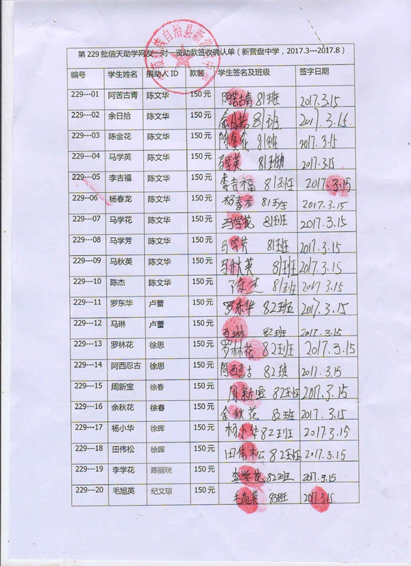第229批新营盘中学(2017年3月到2017年8月)受助学生签收单