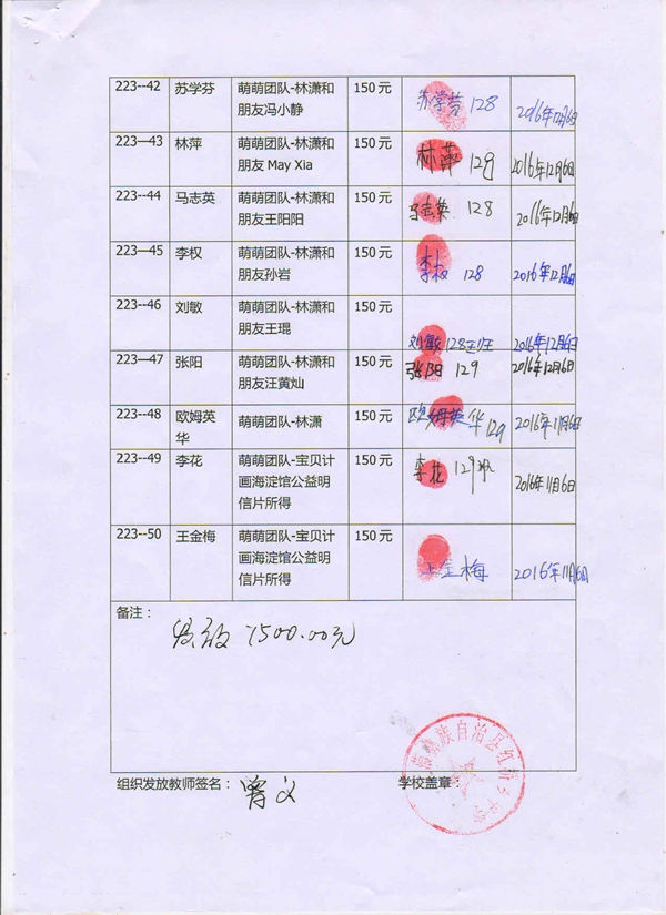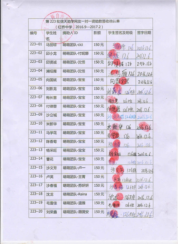 第223批红桥中学(2016年9月-2017年2月)受助生签收单