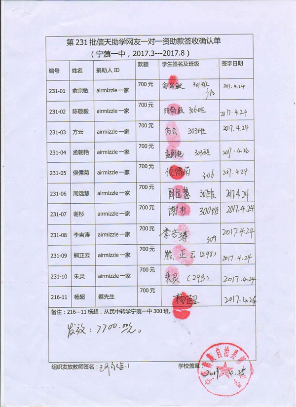2017年7月20日 招行 14000.00 231批 airmizzle确认汇出 10名学生高中一学年的资助款(2017年9月到2018年7月)