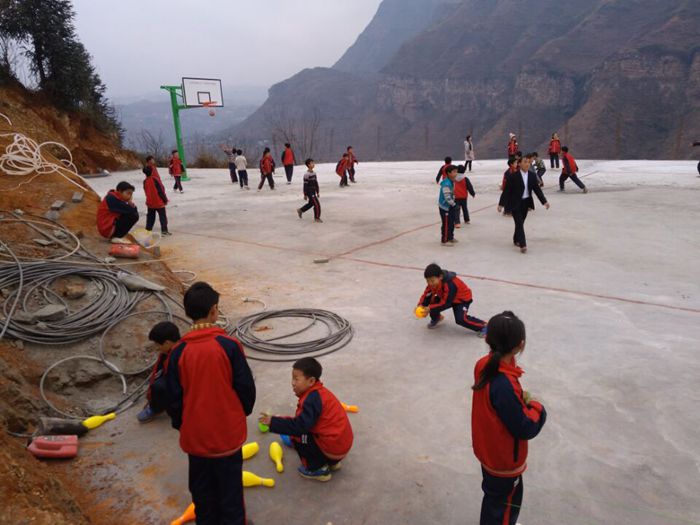 穿上了新校服,在刚修建好的操场上活动(操场临江河的那边铁丝网还没有拉上)。