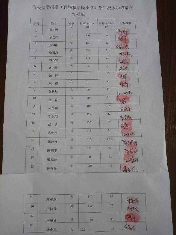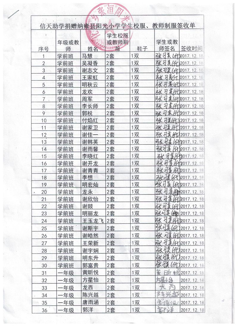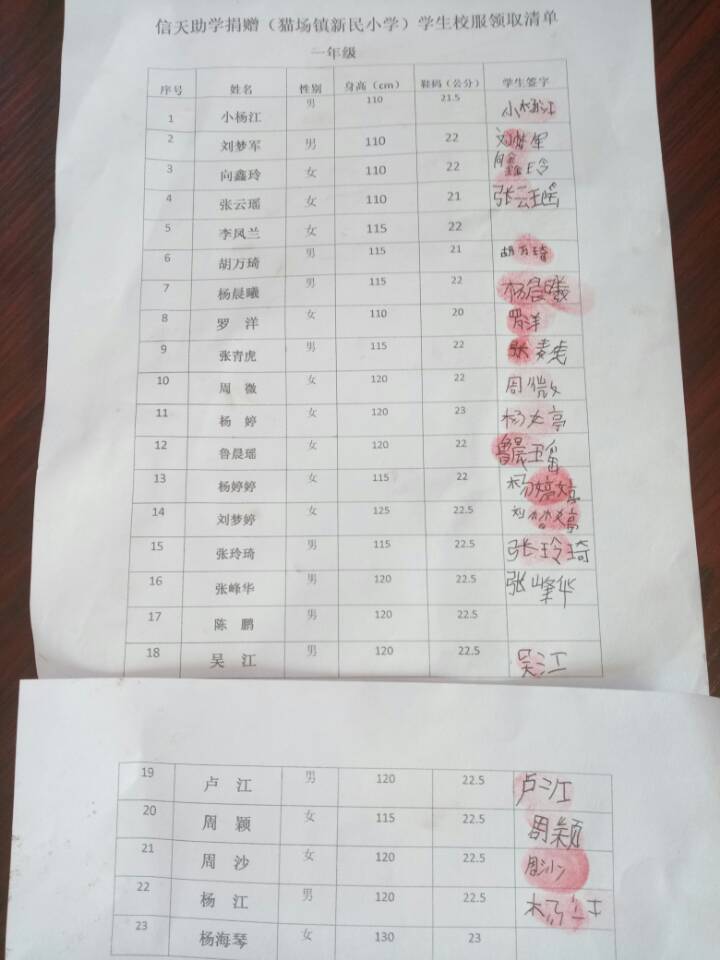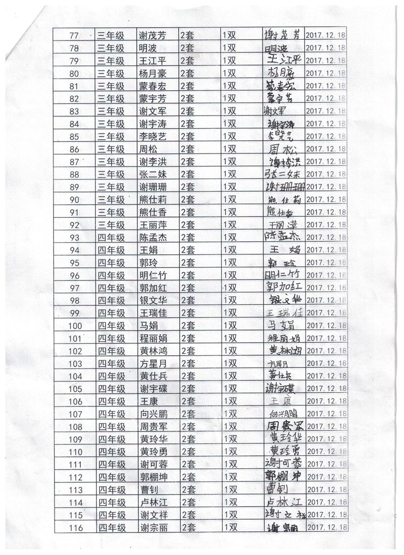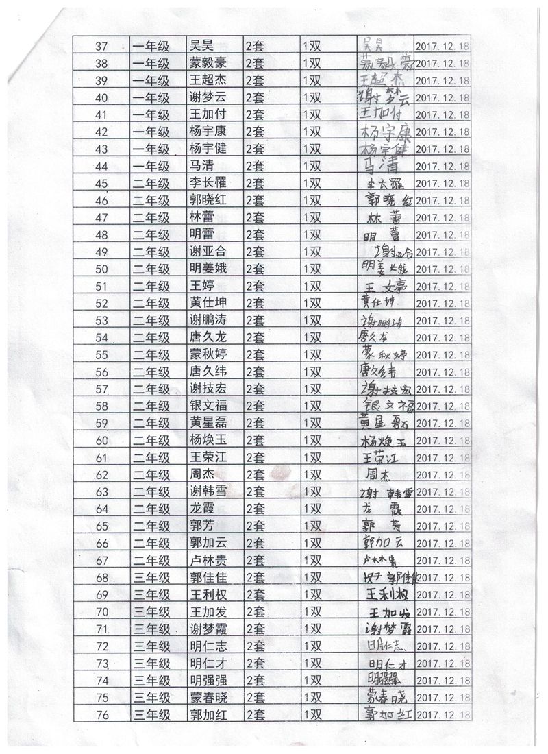 两个学校的负责人,12月18号已经领到衣服,并且分发给学生,这张签收单两个学校负责人是后补签的日期填写为12月29日,谢谢理解。
