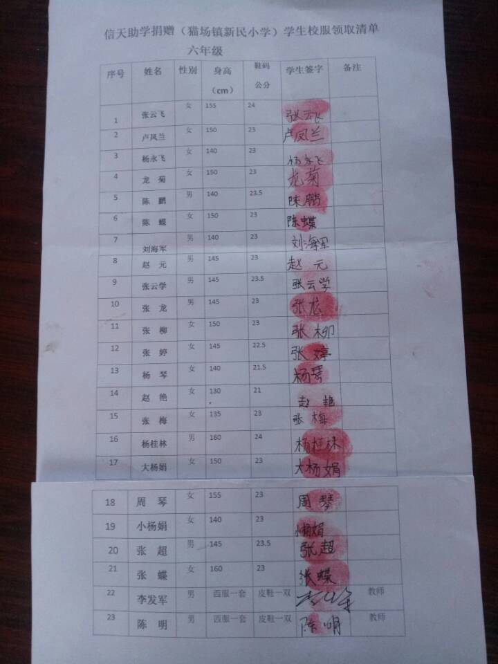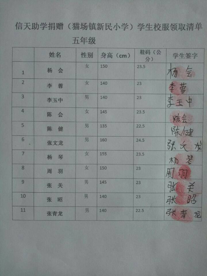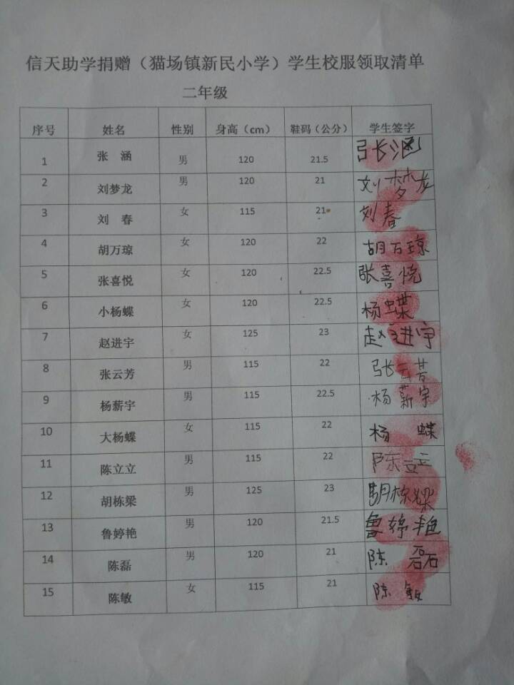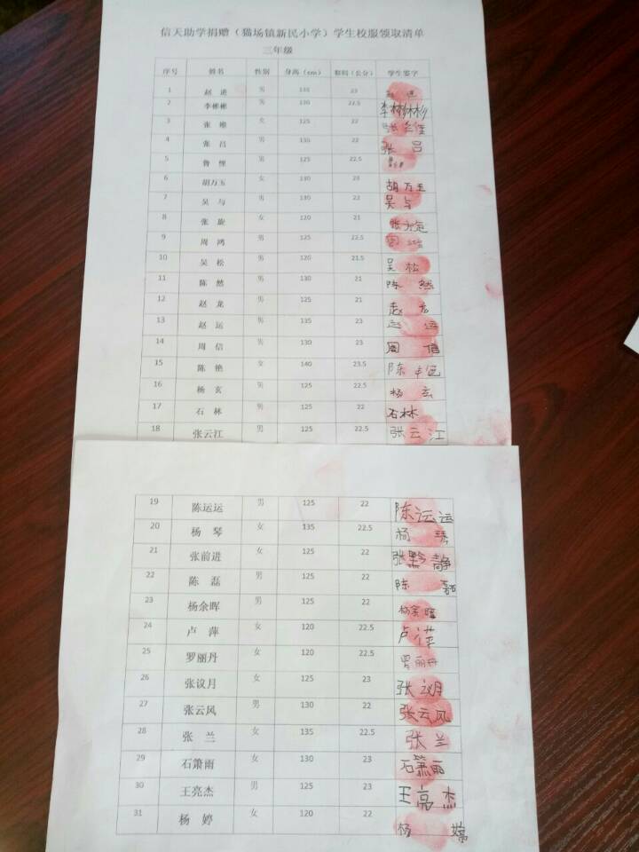 新民小学分发衣服及签收单