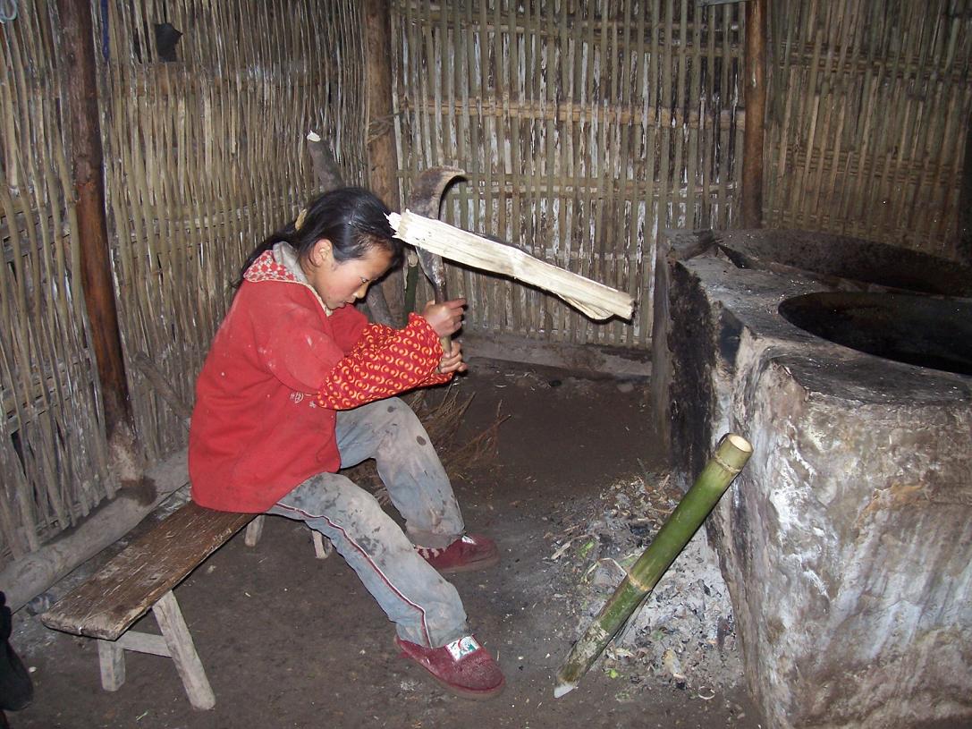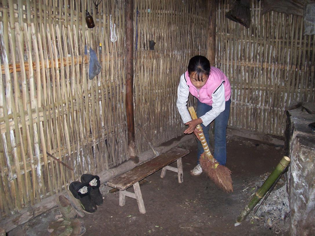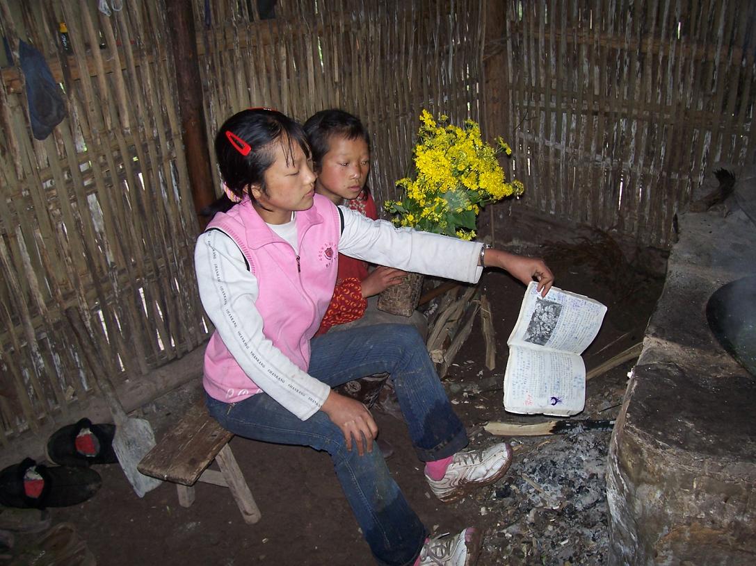 介绍一下我所了解到的情况吧: 这一家住在不通公路的东湾村石坂组,离开我们正在帮助建学校的东湾有40-50分钟山路,这个组仅有20户人家,又分散居住在坎上坎下。杜家两姐妹的家是住在坎下。姐姐叫杜文敏,刚15岁,读到过小学午年级一学期,已经辍学一年多了,现在在家里帮助父亲做事情。妹妹杜文琴,12岁,只读了小学一年级,一直辍学在家……