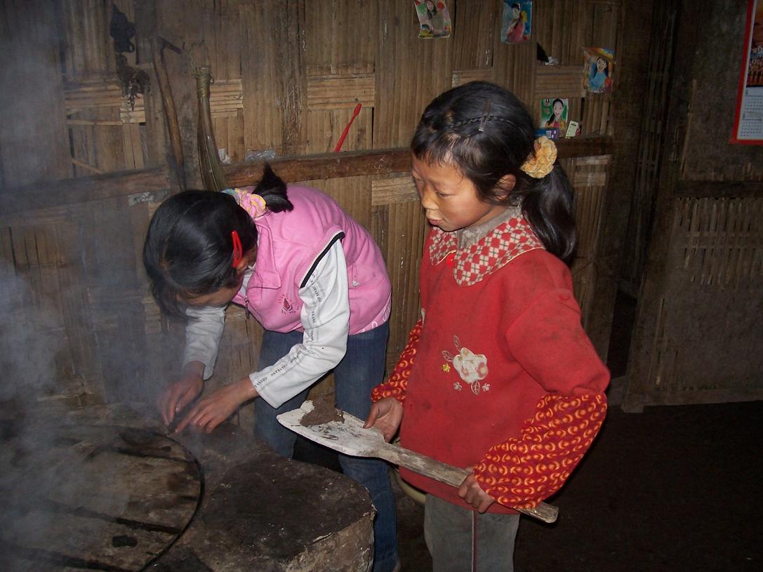 锅灶坏了,两姐妹和了泥巴来补……