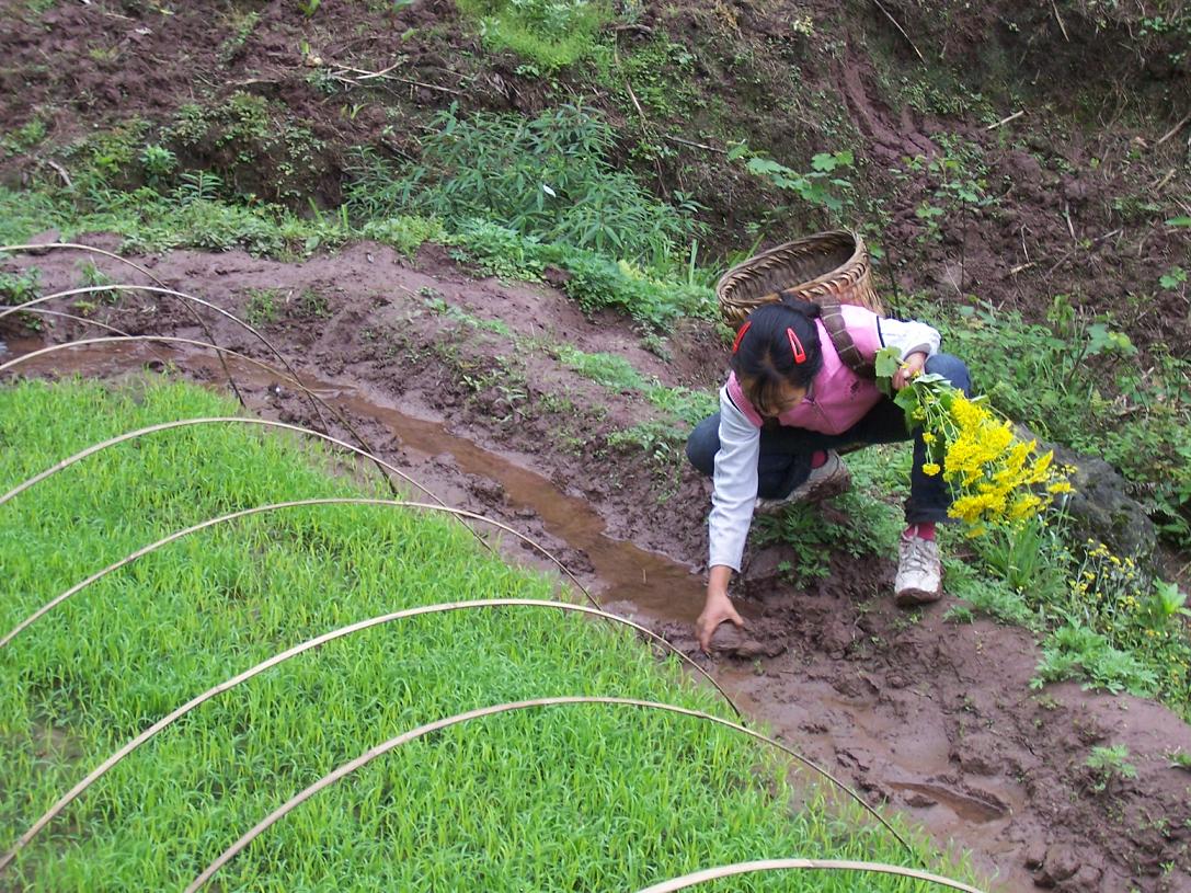 自家秧田里跑水了,挖些泥巴补一下……