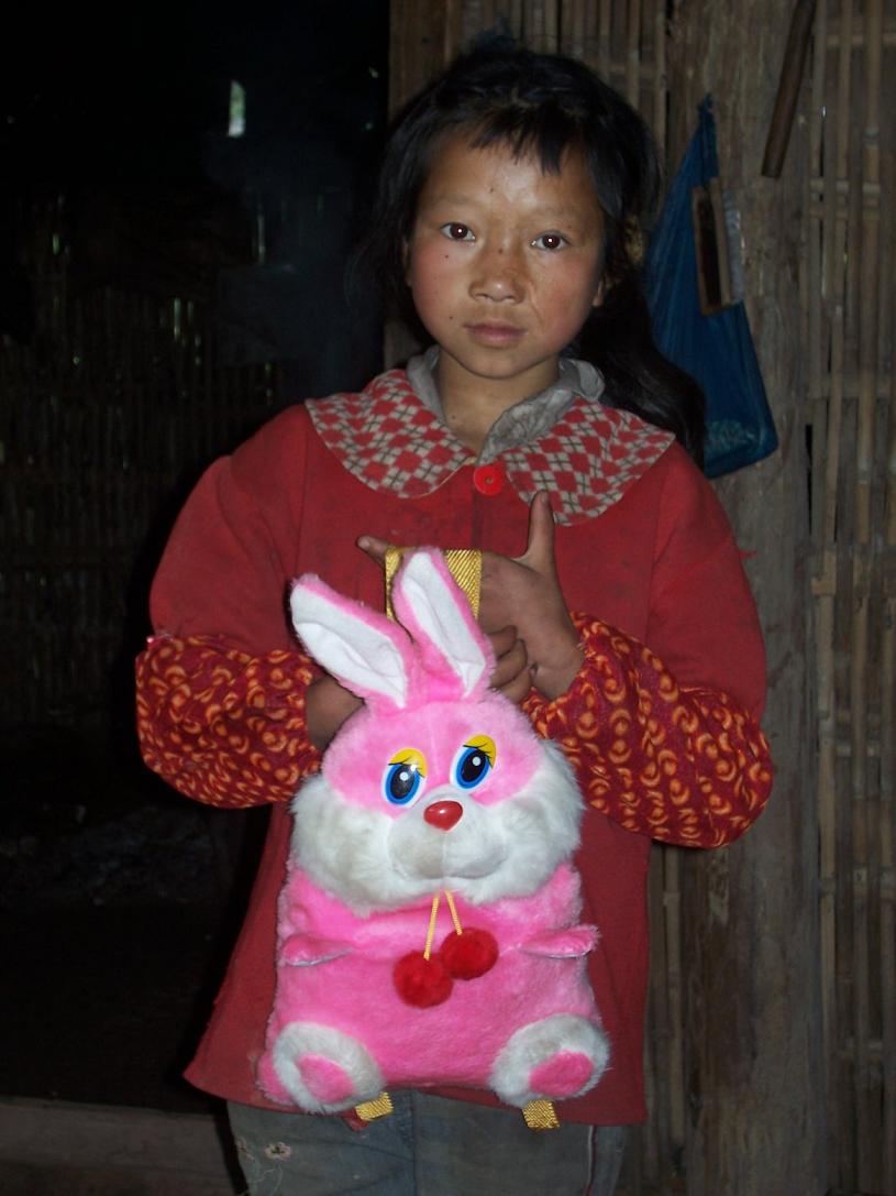 妹妹把自己珍藏的花5元钱买的兔子包包拿出来给我看——山里的女孩子也是很爱美的啊……