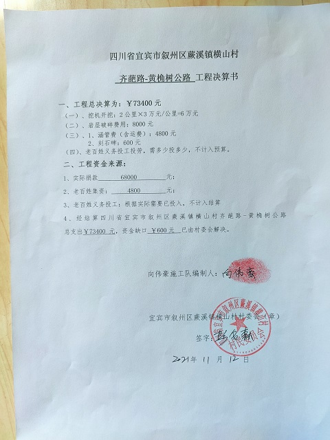 (5)修路预算分好几部分,有挖掘机、涵管、炸药爆破(山崖需要爆破)或者岩石破碎、堡坎、村民义务工、征地等。修路,捐款方不全包,捐款方出一大部分钱:挖掘费用、部分山崖爆破(如有的话)或破碎等。村民出义务工、涵管、征地费、或部分破碎费用,村民小额集资。