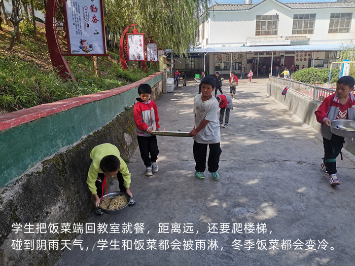 目前食堂仅够容纳200余人在食堂就餐,学校想了多种办法安排学生不同时段就餐,但依旧无法满足全校学生在餐厅就餐。目前只有初中生(7-9年级)在食堂就餐,1-6年级学生均需学生把饭菜端回教室就餐(爬楼梯),导致教室环境严重受到影响。碰到阴雨天气,学生和饭菜都会被雨淋,冬季饭菜都会变冷。