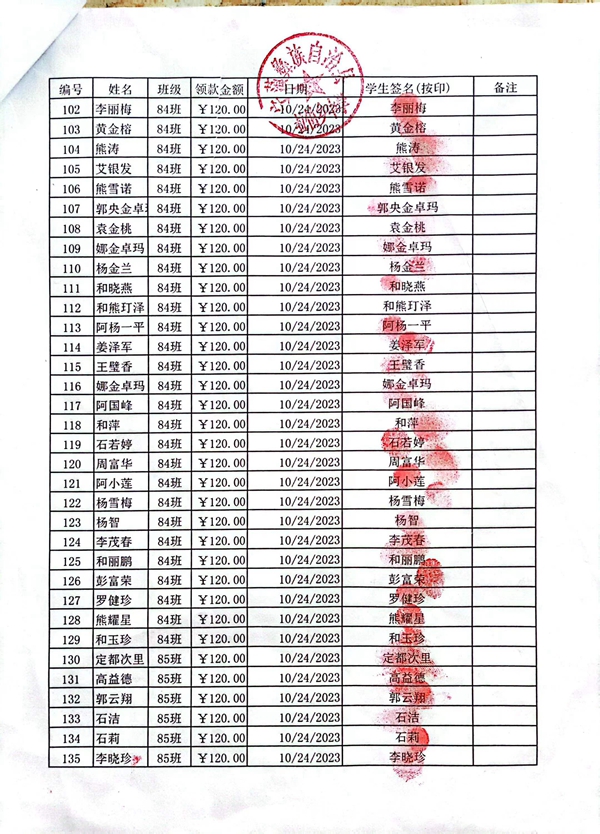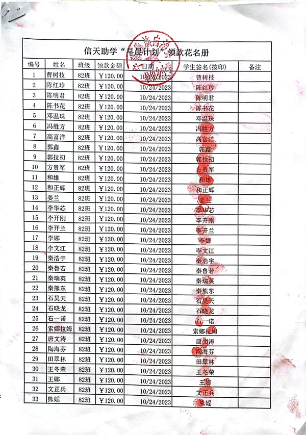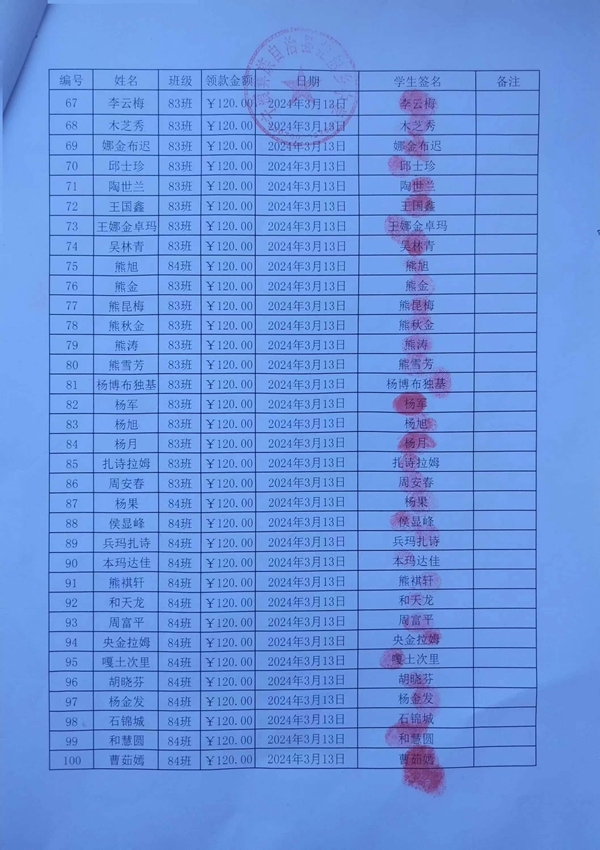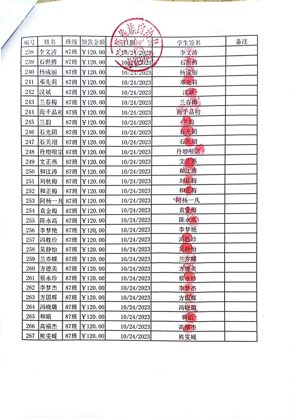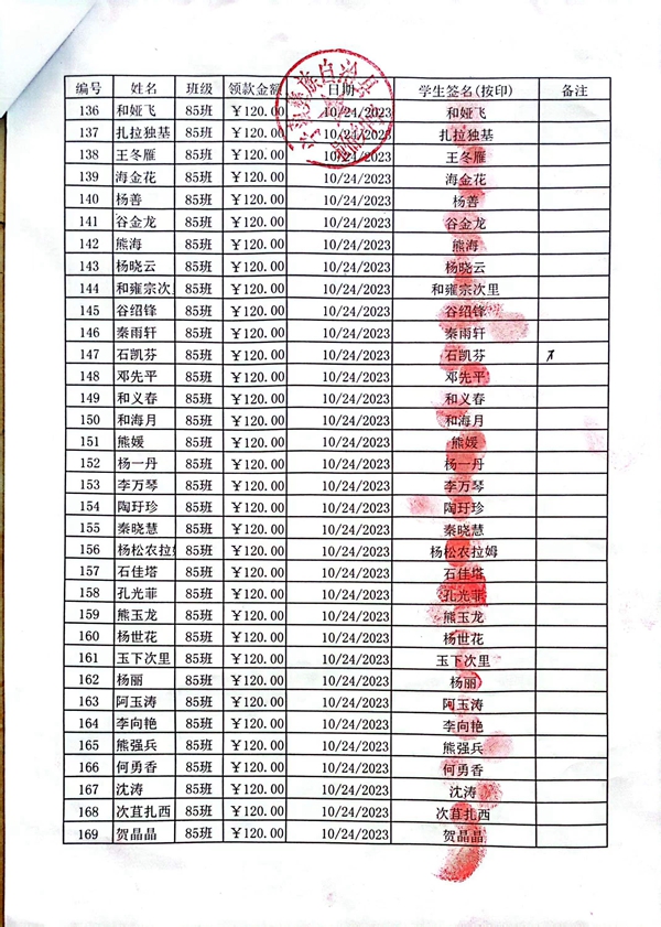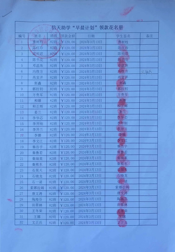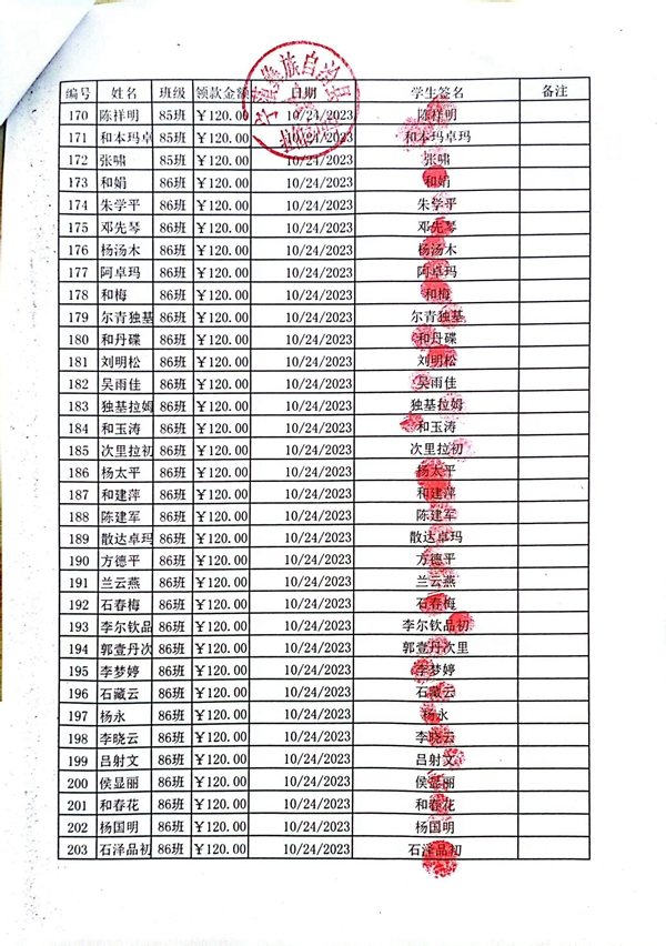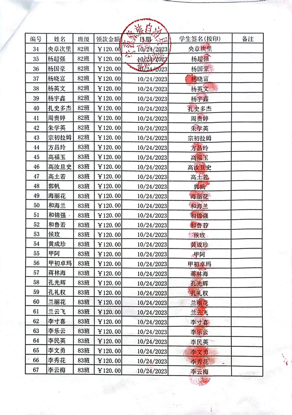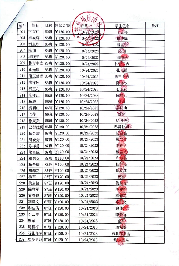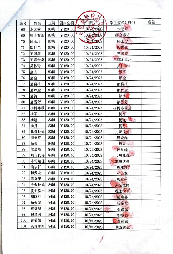 拉伯中学,2023-2024年上学期早餐计划第一次发款签收单