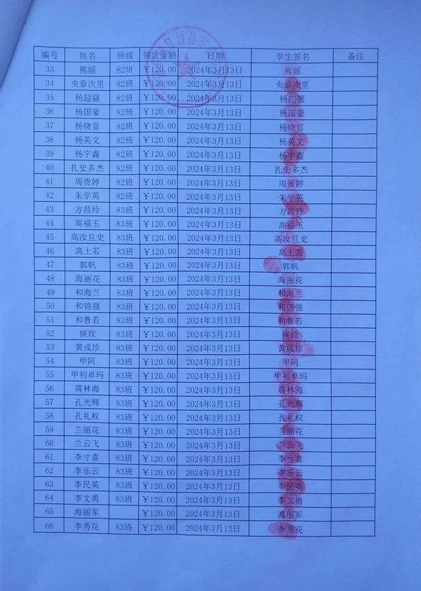 拉伯中学,2023-2024年下学期早餐计划第二次发款签收单