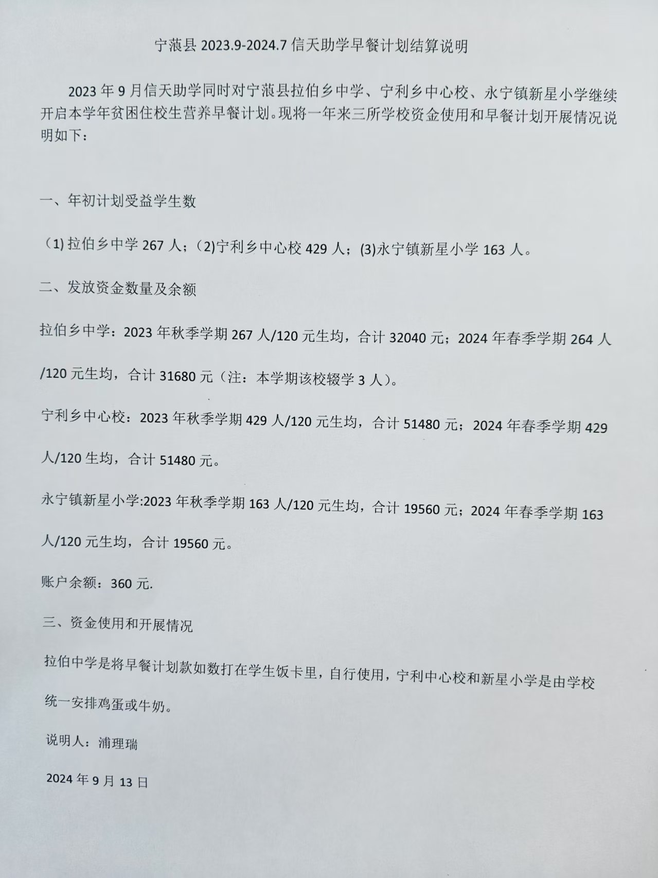 (三)上一年度(2023.9-2024.7)有结余360元在浦老师处,因为有3名学生在下学期辍学了,120元*3人=360元结余下来了。