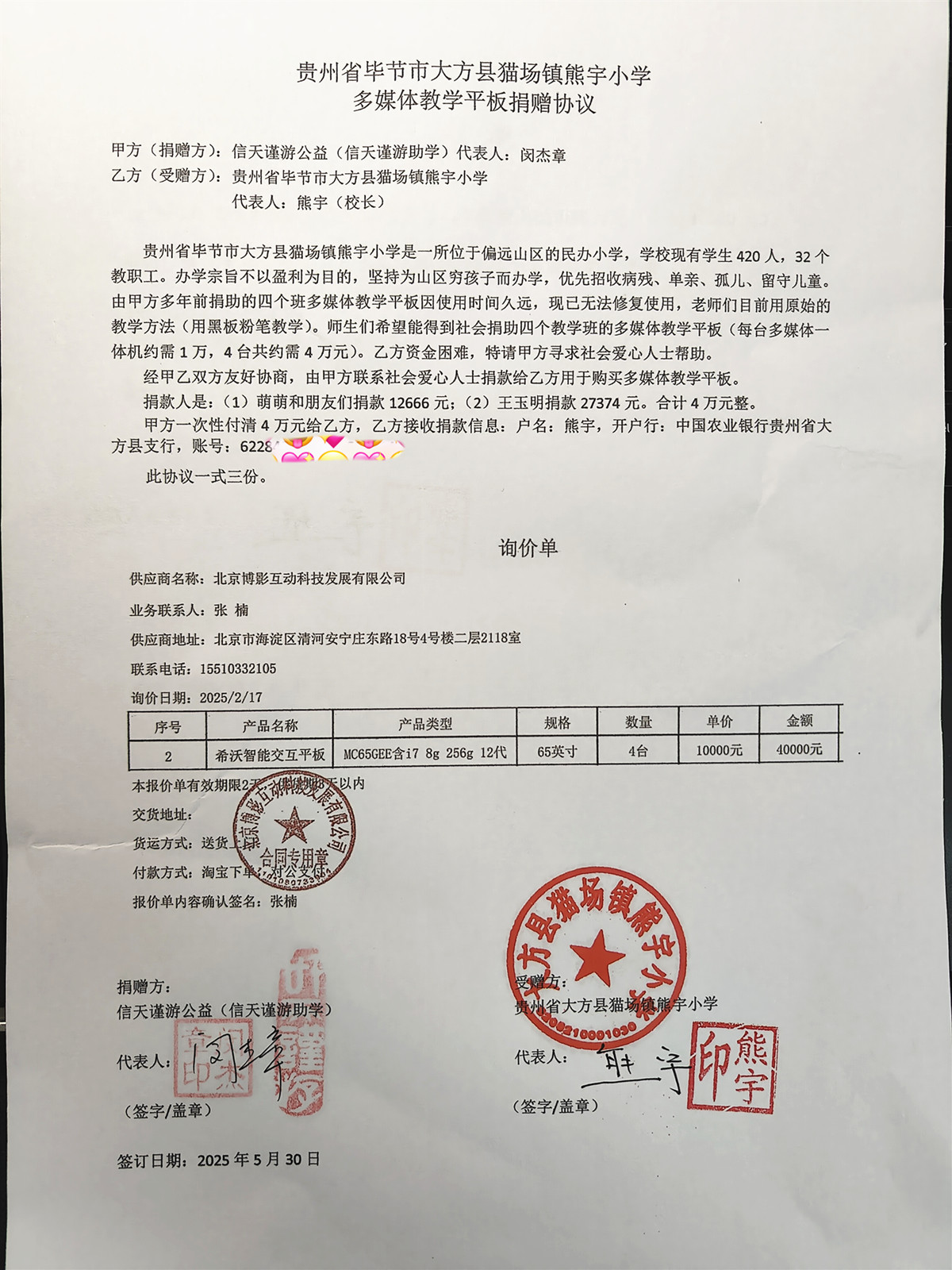 贵州省毕节市大方县猫场镇熊宇小学是一所位于偏远山区的民办小学,学校现有学生420人,32个教职工。办学宗旨不以盈利为目的,坚持为山区穷孩子而办学,优先招收病残、单亲、孤儿、留守儿童。学校有四个班多媒体教学平板因使用时间久远,现已无法修复使用,老师们目前用原始的教学方法(用黑板粉笔教学)。师生们希望能得到社会捐助四个教学班的多媒体教学平板(每台多媒体一体机约需1万,4台共约需4万元),谢谢。