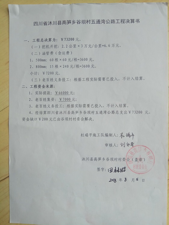 (5)修路预算分好几部分,有挖掘机、涵管、炸药爆破(山崖需要爆破)、堡坎、村民义务工、征地等。修路,我们不全包,我们出一大部分钱:挖掘费用、山崖爆破等。村民出义务工、涵管、征地费、村民小额集资。