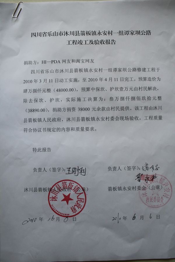 淘宝店出售项目金额汇总—第8条:四川沐川县永安村一组谭家坝公路2期(2010.8.15-2010.9.18)