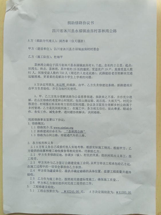 (1)爱心人捐款、村民投工投劳一起修土路,干季可以通车;