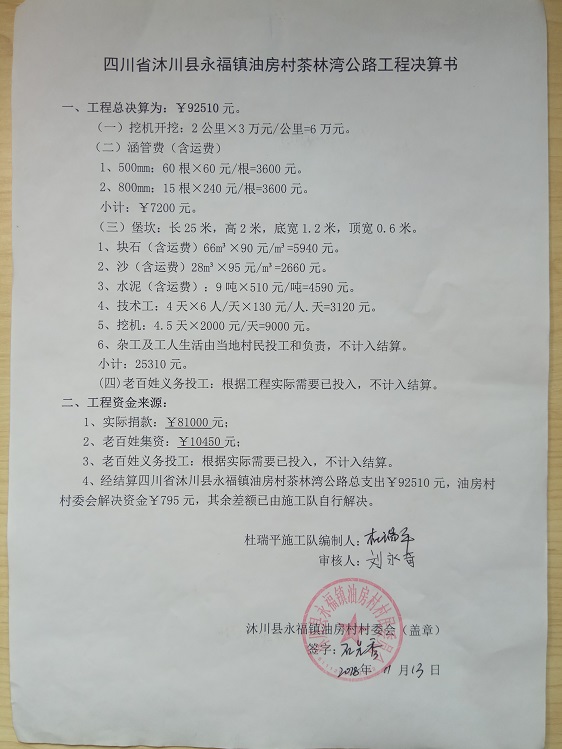 (5)修路预算分好几部分,有挖掘机、涵管、炸药爆破(山崖需要爆破)、堡坎、村民义务工、征地等。修路,我们不全包,我们出一大部分钱:挖掘费用、山崖爆破等。村民出义务工、涵管、征地费、村民小额集资.