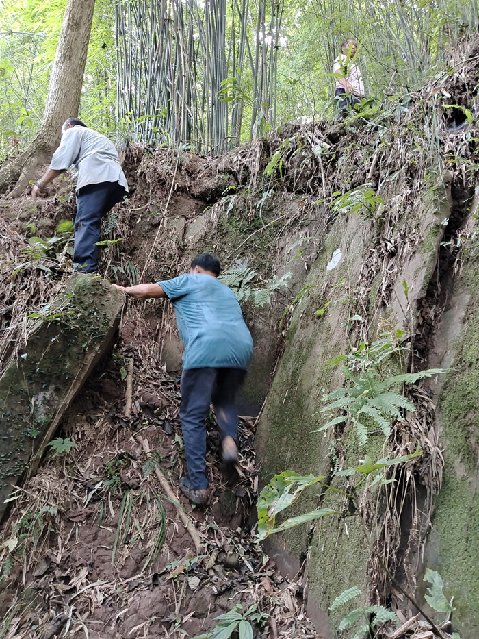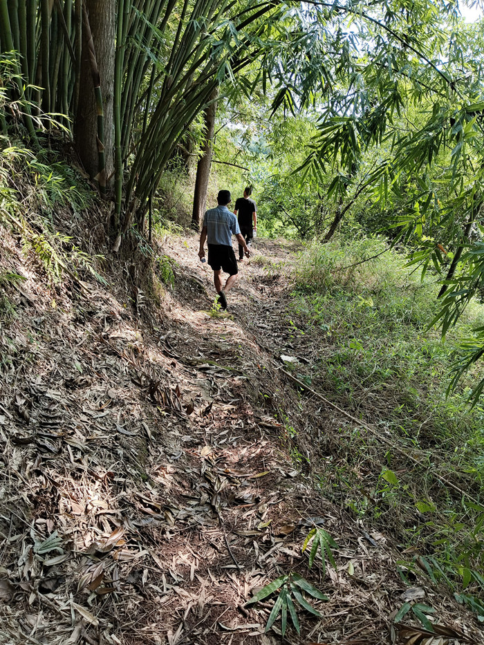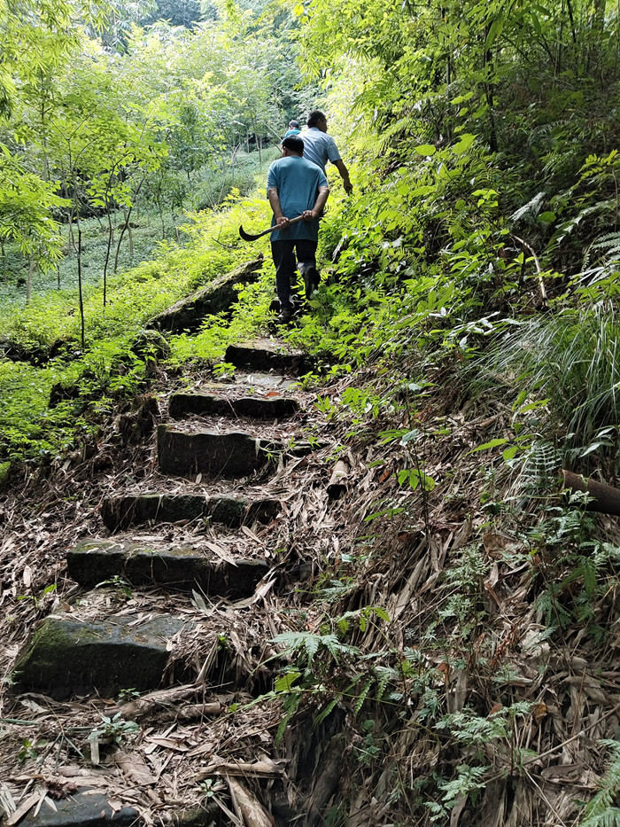 村民勘察路线,计划把这里的羊肠小道扩宽修建成能跑四轮车的乡间土质公路。