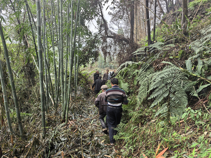 村民勘察路线,计划把这里的羊肠小道扩宽修建成能跑四轮车的乡间土质公路。