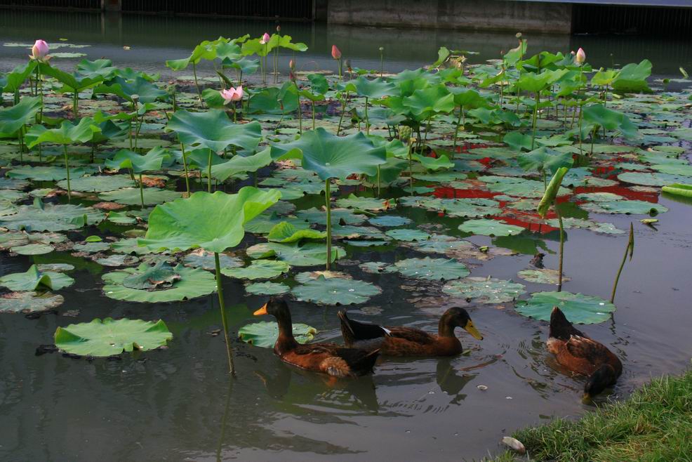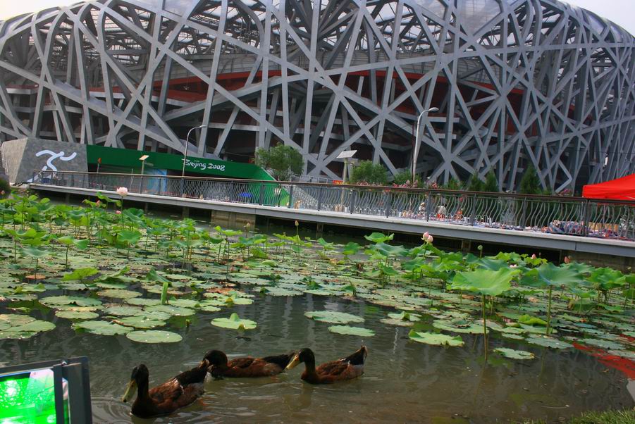 : [鸟巢湖里的鸭子,它们自由自在地游泳]