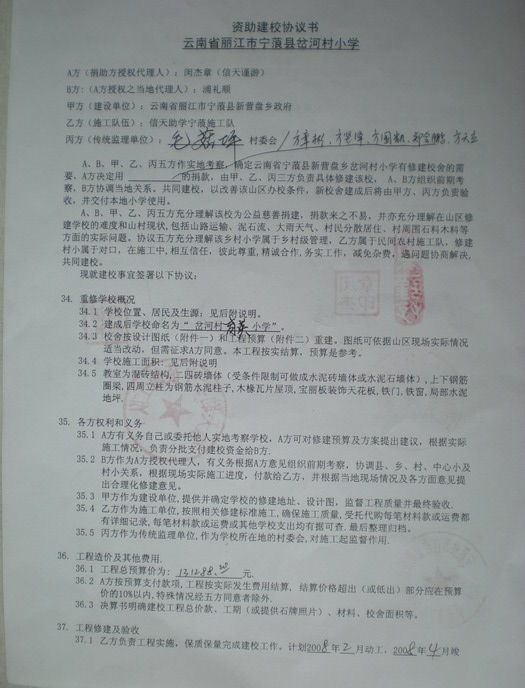 心中有了底,将三万元汇给当地,先期开工了。同时,我又开始在四处筹款,见一个人就说:“我们靠自己的力量在云南援建一所希望小学,只要六万元……当然自愿,多少都行,不捐也行,谢谢谢谢。”突然网上有一个人一下子捐了六千,大事就矣。