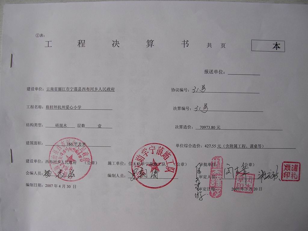 捐助人通过慈善会,再通过宁蒗县教育局渠道,然后再由我们具体修建此学校,故该校授权委托书不同于我们修建的其他学校。由捐助人与教育局签署部分文件,资助款通过教育局走帐,再拨给当地修建委托人浦礼顺先生。