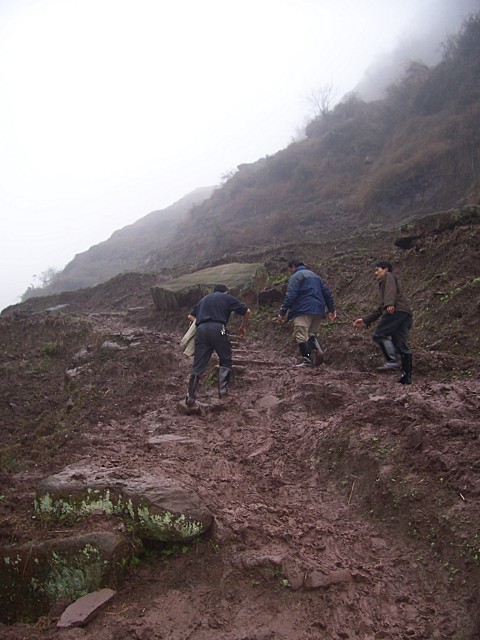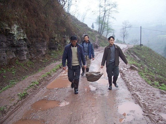 周老师和Dennis Xu乘班车赶到苏坝乡,学校的朱老师和村干带他们去白店儿。他们告诉周老师和Dennis Xu,学校已经开始砌墙了,由于连日下雨,后面山坡的土垮下来一些,需要处理,他们带了一些畚箕上去,准备用来把垮下来的土提清理出去