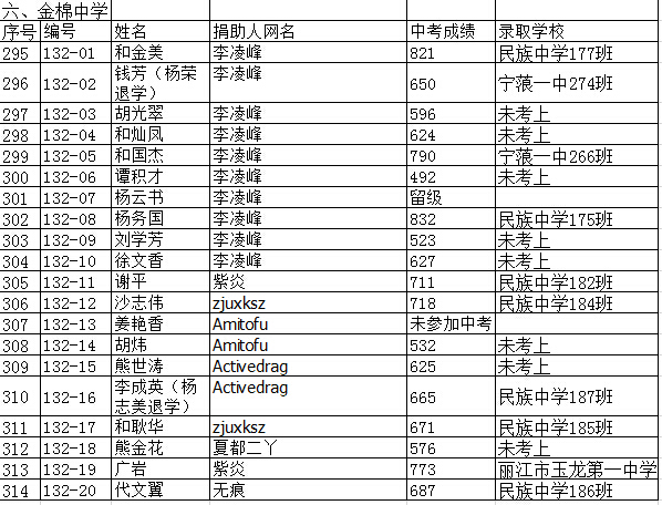 新编号------ 原编号-------学生姓名-------捐助人ID------中考成绩--------录取学校-------------高一收款说明-------------------高二收款说明-------------高三收款说明