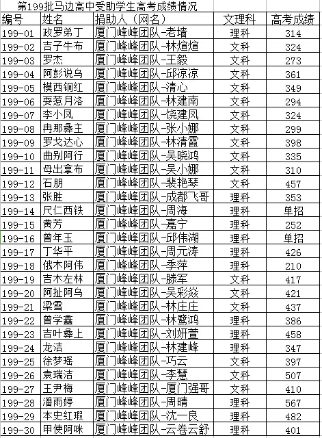 今年高中毕业的有180批、181批、182批、183批,199批(马边高中)共5批,总人数196名学生参加高考。谢谢大家的多年资助,隔着千山万水,你们向山区孩子伸出了热情之手,每年源源不断的资助使学生们得到了有力的支持和帮助,让助学的活动得以延续。再次感谢大家。