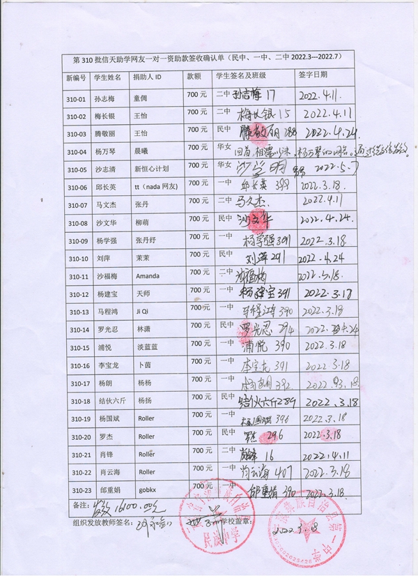 第310批高中续捐(2022年3月-2022年7月)受助学生签收单