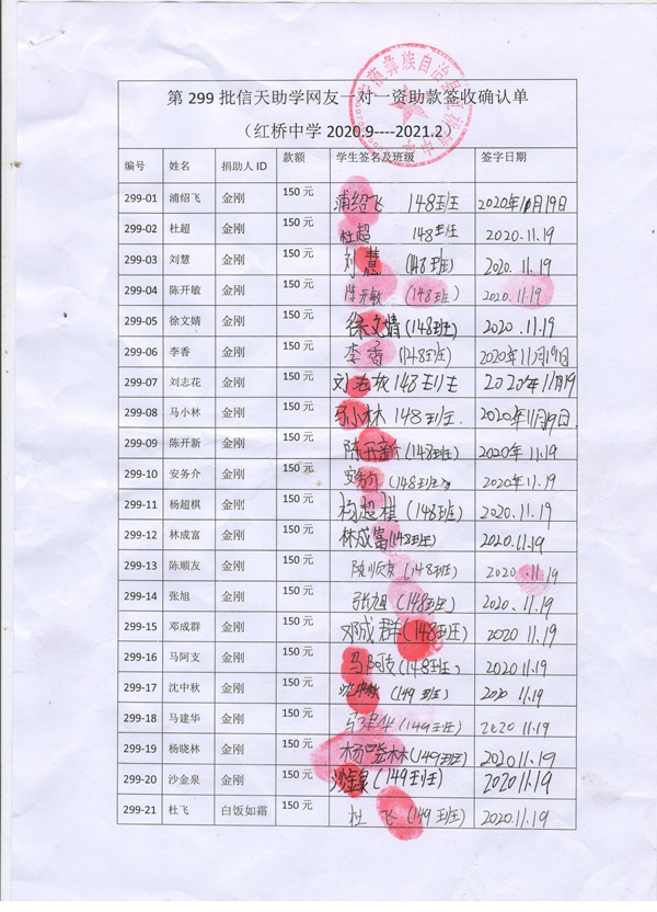 第299批红桥中学(2020年9月-2021年2月)受助生签收单