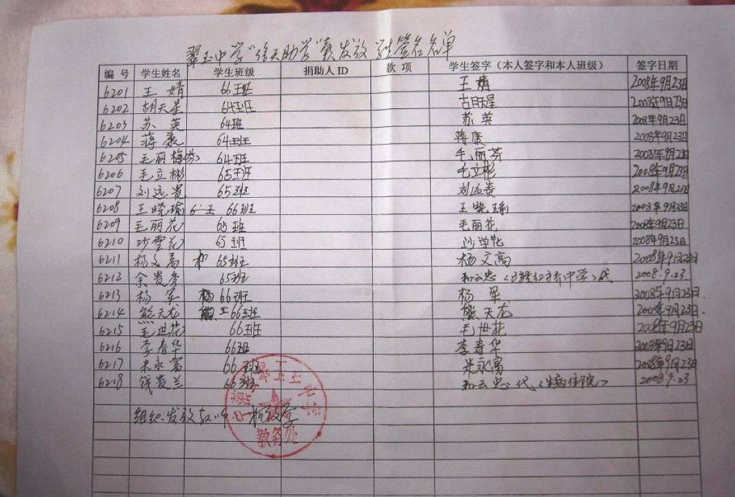 » 信天助学一对一08年9月各批次资助款签收单