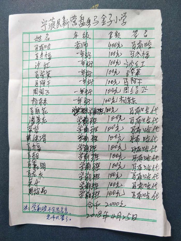 4月25日,浦老师和助手一起到了马金子小学发放资助款。