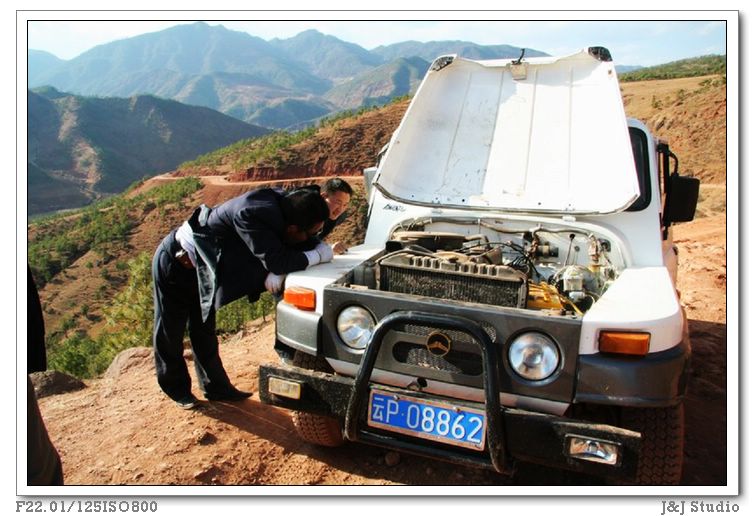 下午一点我们和老浦、乡长等一行出发前往马金子村。开头的一段,走的是回头路,从丽江过来的公路,之前一个分叉点往东南方向下去就是新营盘乡,这段路路况一般,这样跑了一个多小时,到了新营盘乡乡政府。这里多半是彝族,因为是过年吧,大多数人都穿着民族服装,年轻人牵着骡马拉着车忙碌着,街头的小店铺里出售着各种廉价的小商品。整个乡的所有繁华商业都集中在这条窄街上,另人吃惊的是,全乡最好的建筑是一幢三层楼高的学校。还没等我看清什么学校,车子突然一拐,往路旁的陡坡扎去,两旁都是垃圾堆,正以为车子出了什么事故呢,乡长冷静地说,这就是去马金子的路。这是路吗?连烂土路都不是,放眼往前看去,只见到怪石、泥浆、荆棘丛生。乡长不断一挡二挡地换挡,我们和车辆一起,用各种奇怪姿势向前颠着,我为了保护相机,只得脱下羽绒服把所有设备都包起来紧紧按在腿上。